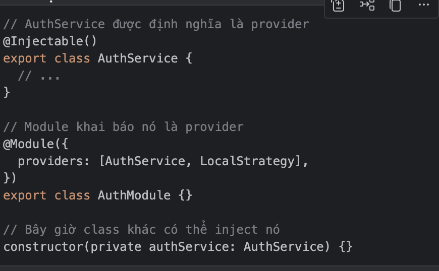• @Injectable() = đây là service/provider → có thể inject vào controller hoặc service khác.